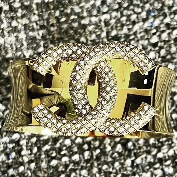 Gold-Tone Rhinestone Double C Brooch Bangle Cuff Bracelet