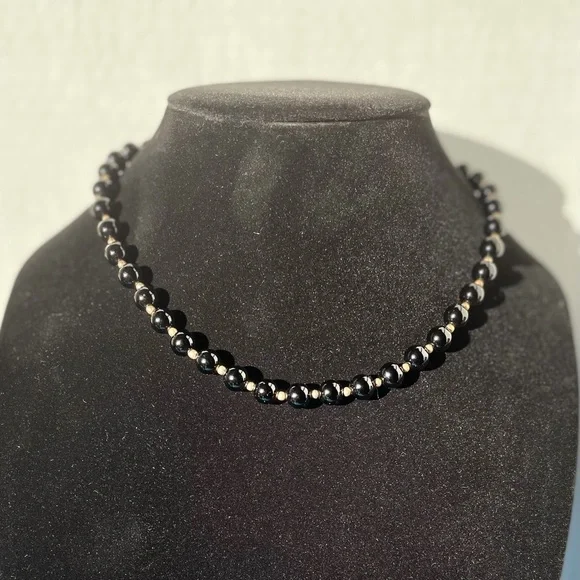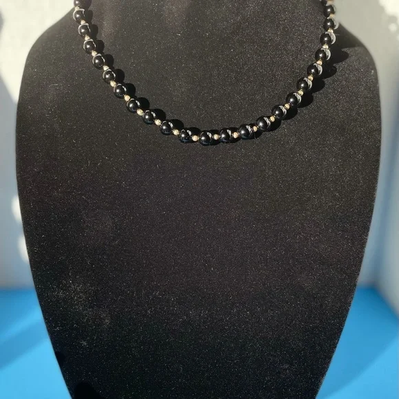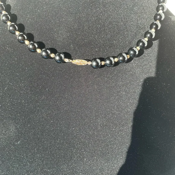 Beautiful 18” necklace of black onyx beads alternating with 14kt spacer beads with 14kt clasp. Stunning looking piece of fine jewelry and very versatile. Wear this with all of your looks and look great every time.Affordable luxury! Don’t miss this deal, prices of gold are on the rise. Matching bracelet and earrings available, please see my other listings.