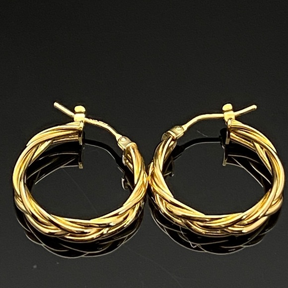 14K Italian Yellow Gold Braided Hoop EarringsThese gold earrings are exquisitely crafted in Italy of high polish finished 14k yellow gold and features a sophisticated, intricate braided hoop earring style. We offer this pair of gold hoop earrings in small hoop earring size that has an inner dimension is 15 mm. With its thickness of 5-mm,weight 3.00gr this pair of braided gold hoop earrings is the perfect statement for any ensemble.#41567