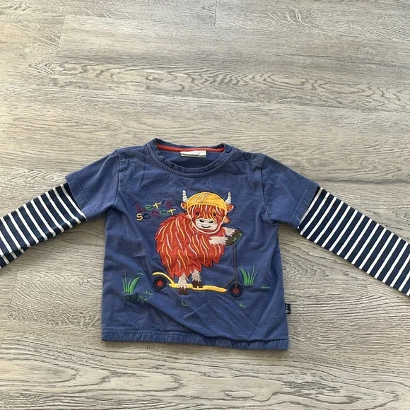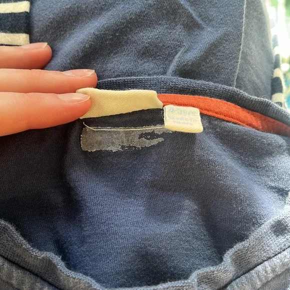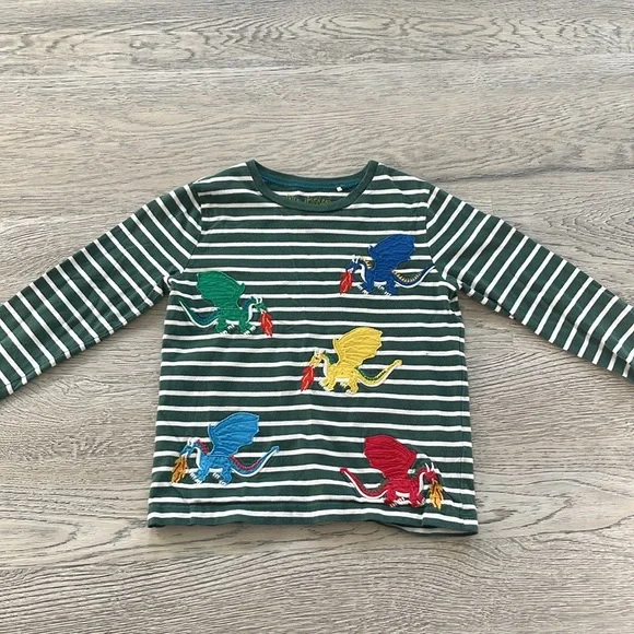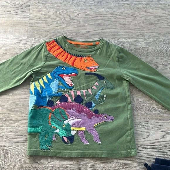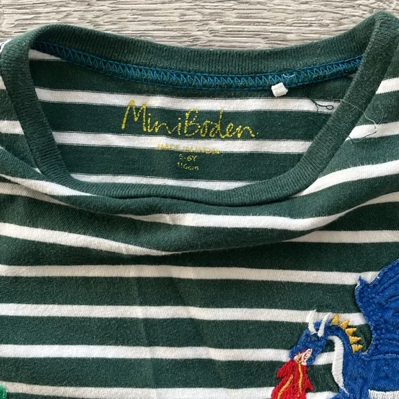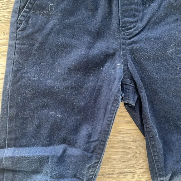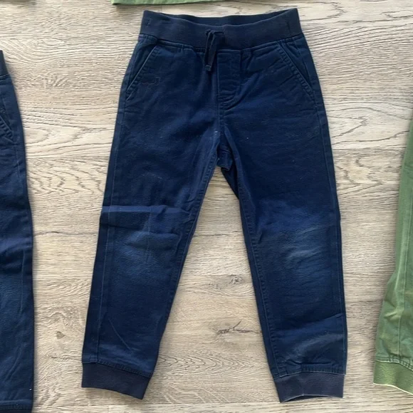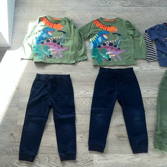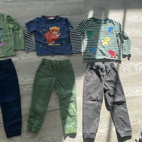 A bundle of four outfits, all size 5! The pants are all Janie & Jack brand (two navy, one green, one grey), and one navy pair has minor stains as pictured. Three shirts are Mini Boden, and one is JoJo Maman Bebe. There’s minor stains on one green shirt as pictured. The JoJo Maman shirt has a minor stains behind the neck tag, which is from having a name label ironed onto the shirt formerly, it’s not sticky! **Some shirts are sized 5-6 or 4-5, as pictured**