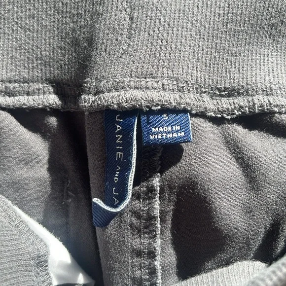A bundle of four outfits, all size 5! The pants are all Janie & Jack brand (two navy, one green, one grey), and one navy pair has minor stains as pictured. Three shirts are Mini...