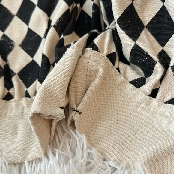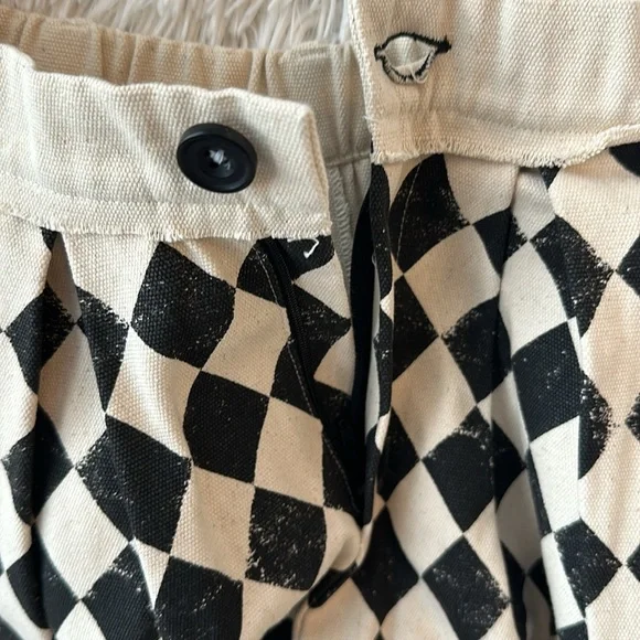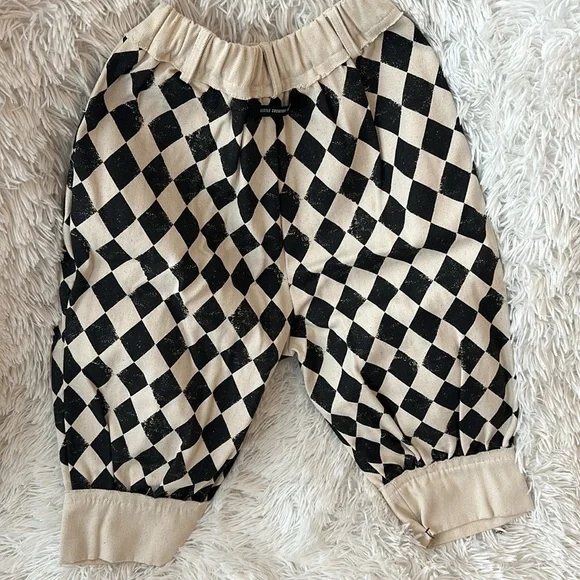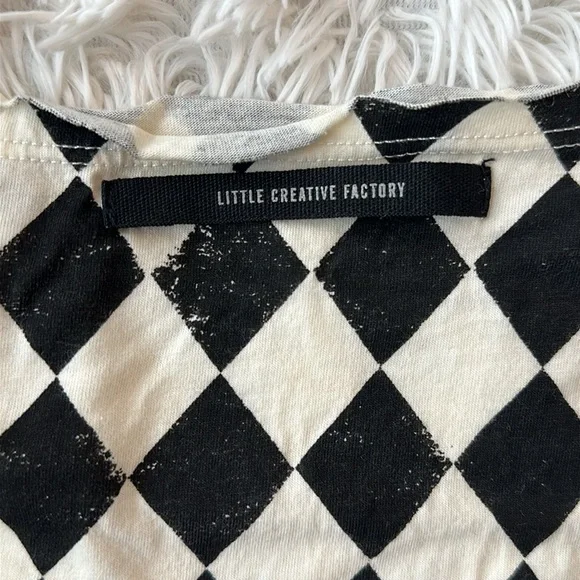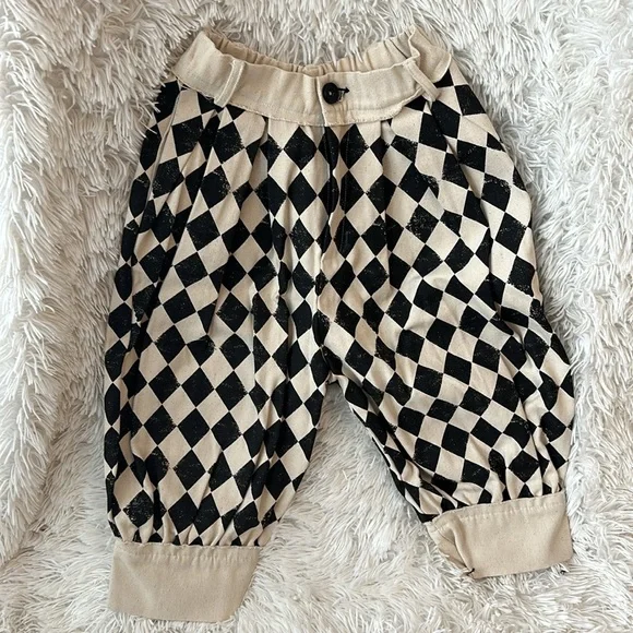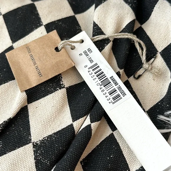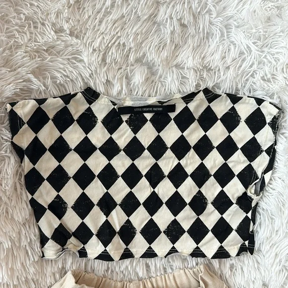 Cream and black Little Creative Factory diamond print set. Worn for a couple of hours only. Trousers are a heavy canvas type material with an easy to remove hem that was added to tighten the ankle opening. See photos. Shirt is a lightweight cotton crop top. Super cute for photos.