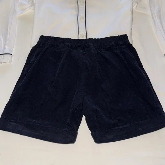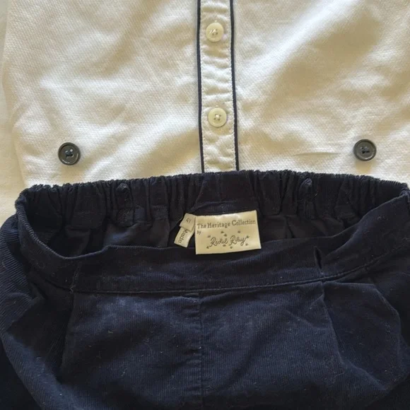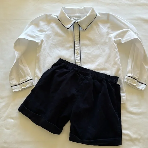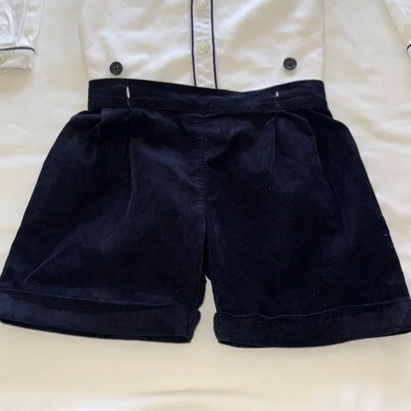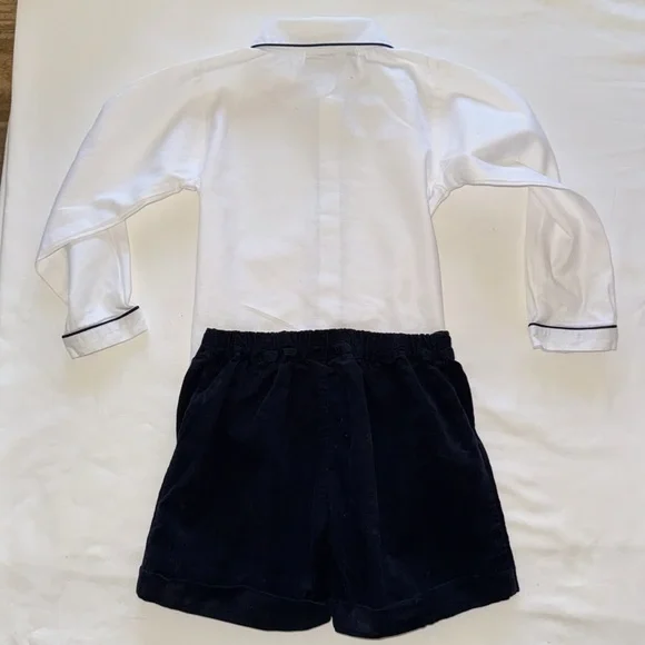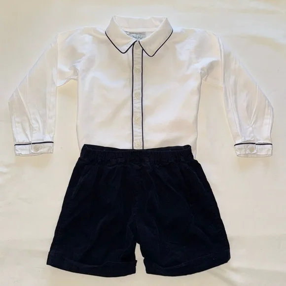 Classic toddler boy outfit from British brand, Rachel Riley, best for special event. My boys wore to wedding at 3.5 years old. “Piped Cotton Button-Up Shirt & Corduroy Shorts Set”A smart shirt and cord short set comprising of a classic white shirt with navy piping detail with matching navy “babycord” (aka soft) cuffed shorts with an elasticated back waist, attached to the shirt with pearl effect buttons. Perfect for a special occasion. 100% cottonMachine wash with similar colors. Medium steam iron.Tags:Ralph Lauren KidsPepa & Co.La CoquettaFeltman Bros.CrewcutsLittle EnglishBella Bliss