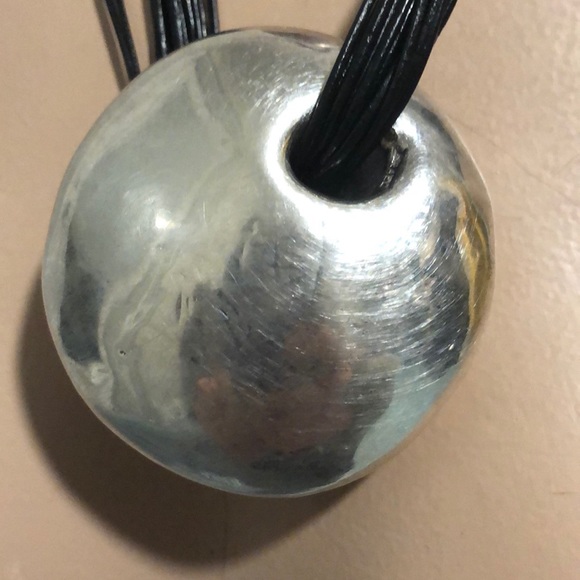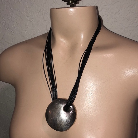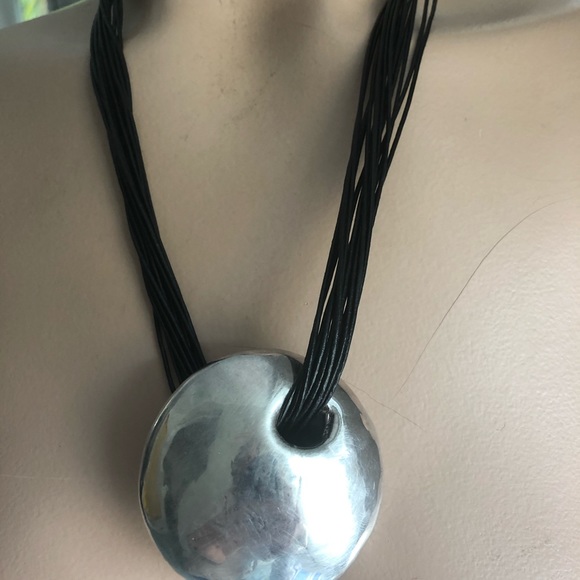 Gorgeous Mod silver circular pod with looping multi strand leather cords necklace. Made in Israel 100% silver 925. Designer unknown very Elsa peretti ,Paloma Picasso for...