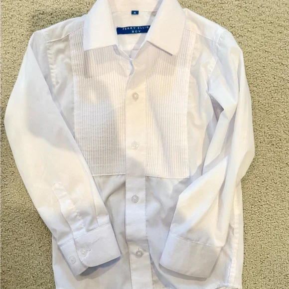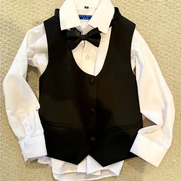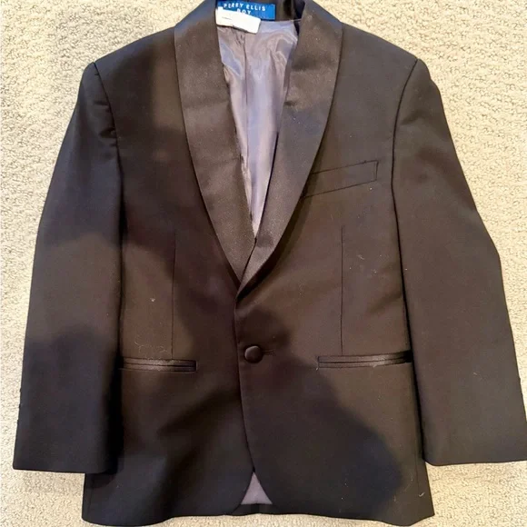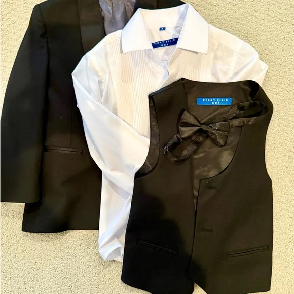 Worn only once, this 5-piece Perry Ellis boys tuxedo set is one you’ll want to grab. Features vest and bow tie and pants are adjustable.Shoes worn with outfit are listed separately but available .