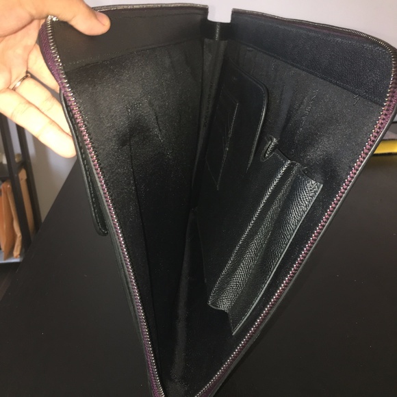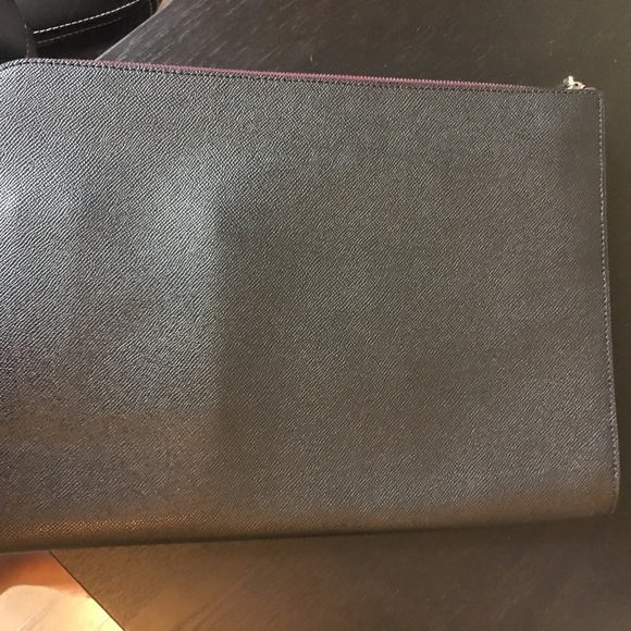 Black Dauphine Leather Document Holder -brand new- never used- excellent conditions- metallic parts still protected by plastic - comes with protective cover- no damage at all - description: zip closure, one external pocket with flap, internal organizer panel, 28cm x 37.5cm