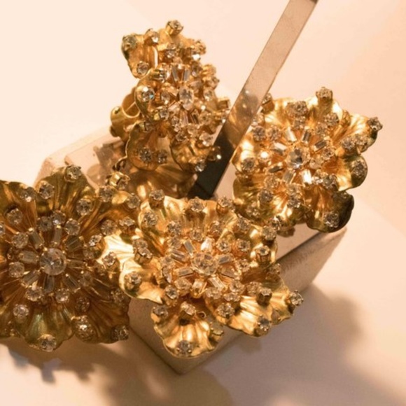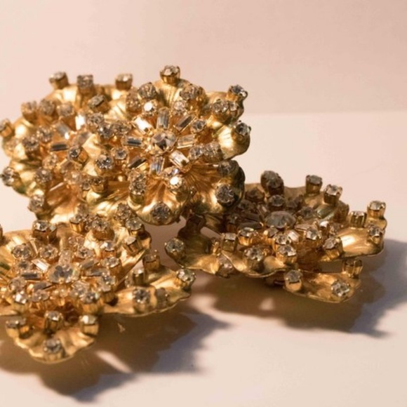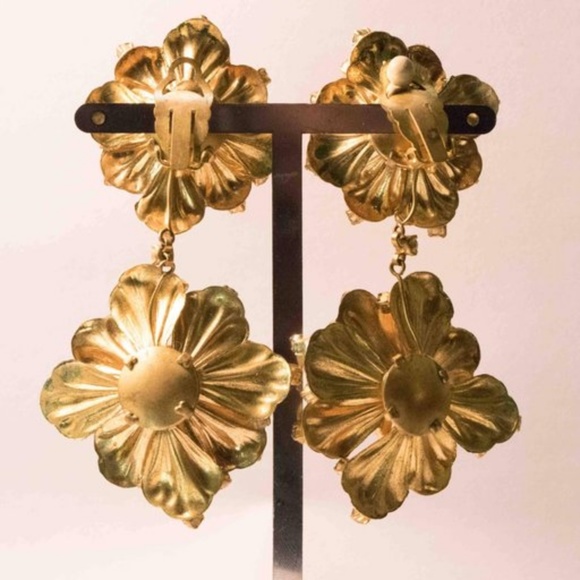 Coco Style Gilt Gold and Rhinestone Stamped "France" Drop Earrings.Beautiful Drop Floral Shape.The Rhinestones adorn the Gilt Gold Earrings looking as if petals are exploding in rhinestone.Excellent Shape.Stamped "France" on the back.Comfortable on ear.Mixed metal gold plating.Measurement of ear petal: 1.5.Drop: 3"