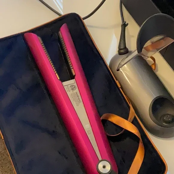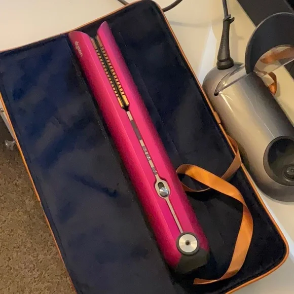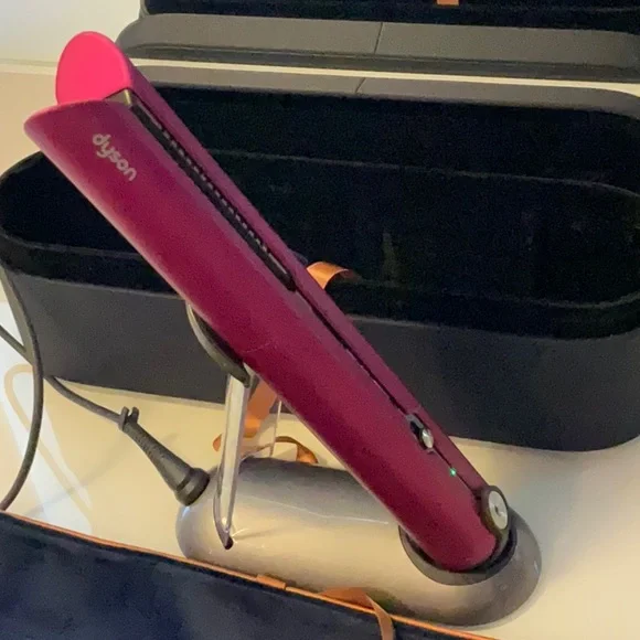 Stylish Dyson hair styler in fuchsia. Includes protective case and charging dock.