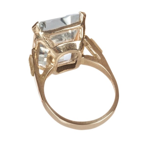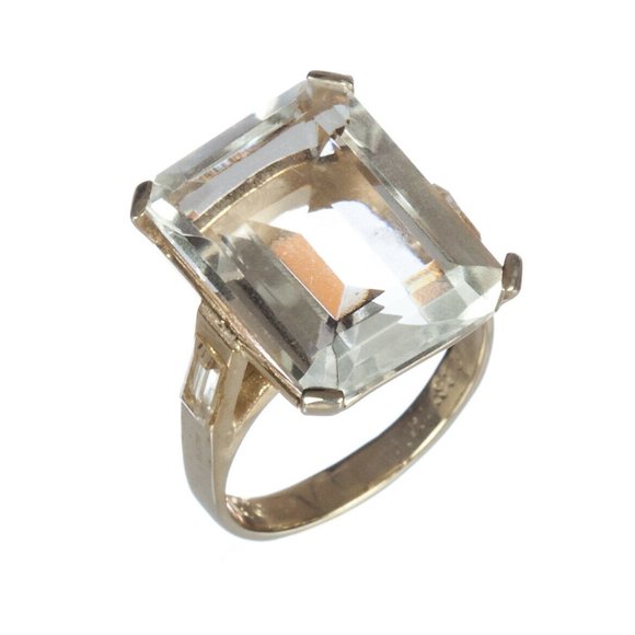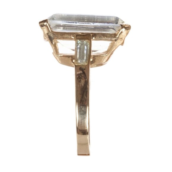 "The base of this ring is sterling silver with a 14 kt gold vermeil...In the very center is a massive emerald cut rock crystal measuring 18 mm´s by 13 mms´...Surrounding...