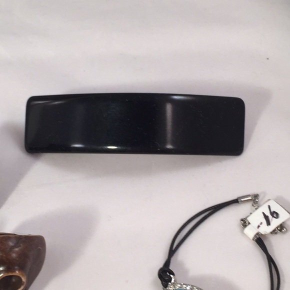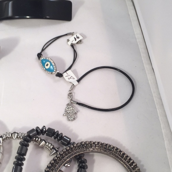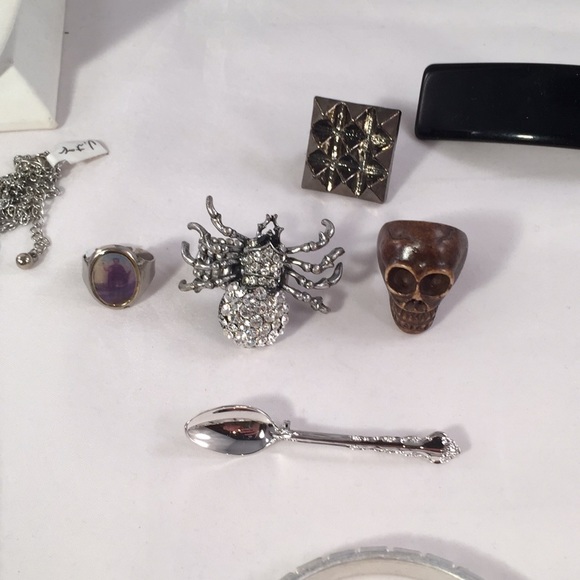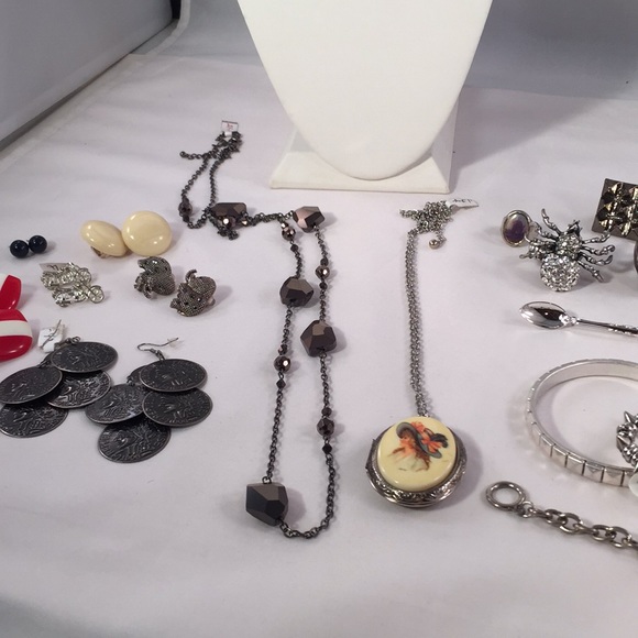 Three necklaces six pairs of earrings for rings one spoon pin one black hair barrette seven bracelets