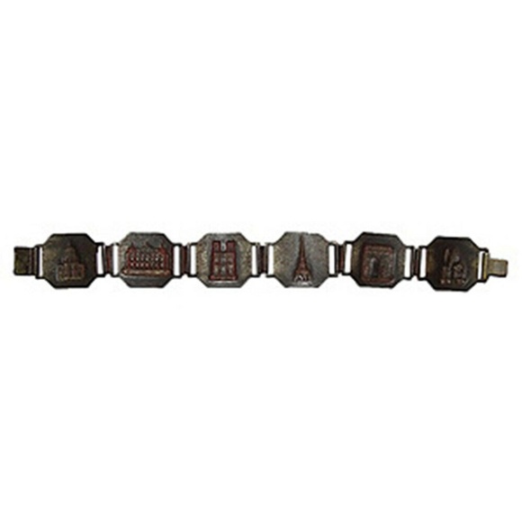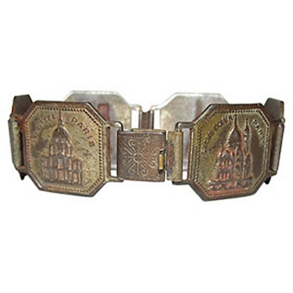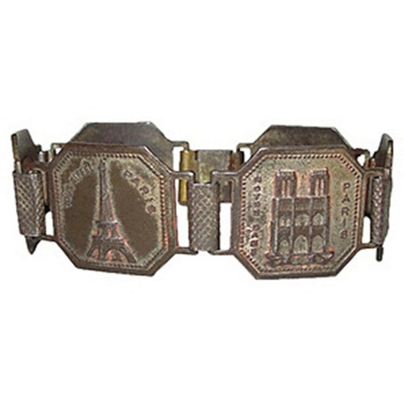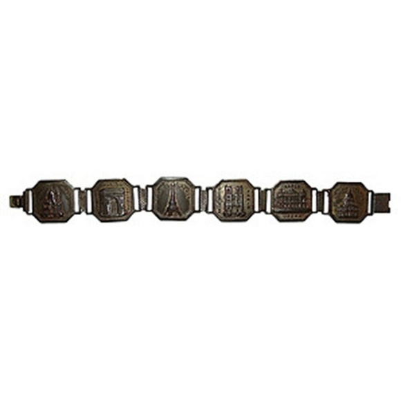 1930s brass bracelet depicting famous Paris landmarks. Closes with a etched box clasp. 7"L. Coins, 0.75”W.