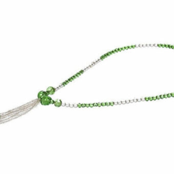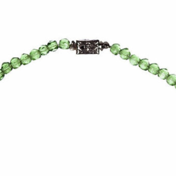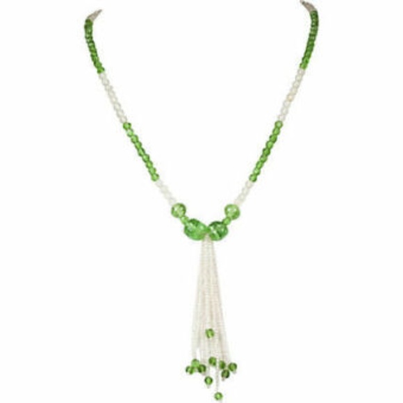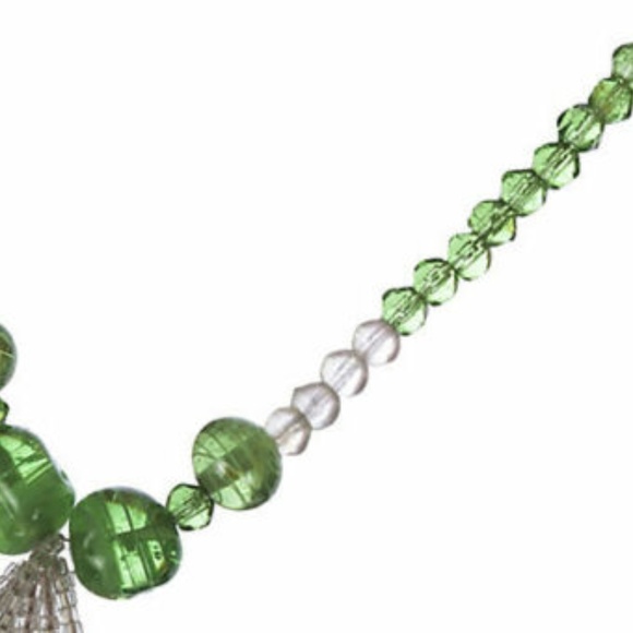 Art Deco tassel necklace with camphor glass beads, Venetian green glass beads, and clear seed beads, circa 1930. Closes with forget-me-not flower box clasp. Tassel, 3.75"L....