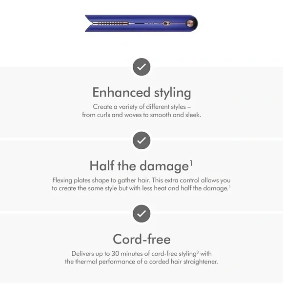 Your Dyson Corrale™ hair straightener has been specifically engineered to be travel-friendly. Its features include universal voltage, cord-free operation, a 36 Watt hour rating,...