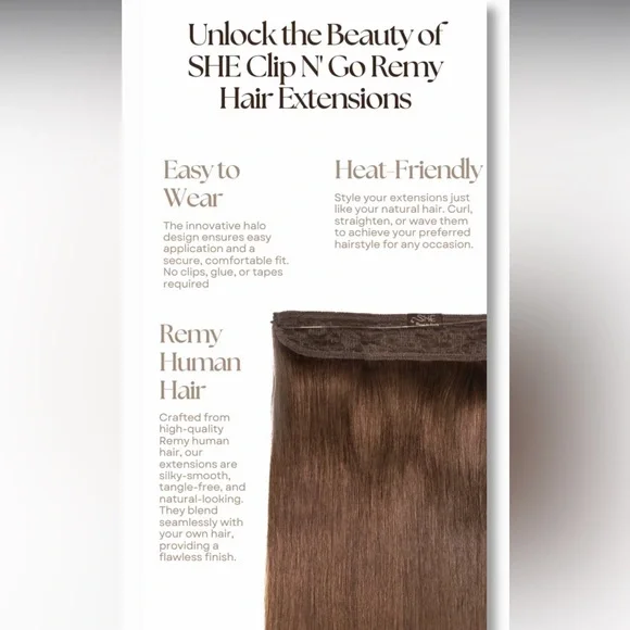 SHE Flip N Go Hair Extension HaloBrand New20-22” Medium Brown Human hair Can use heat to style! Retail $1695