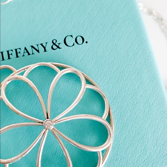 Tiffany & co. Silver flower pendant w/ center diamond.