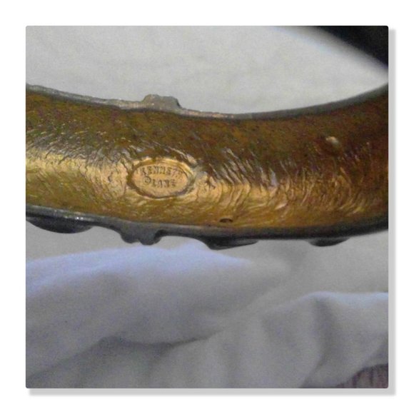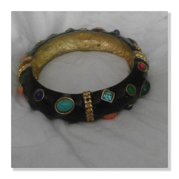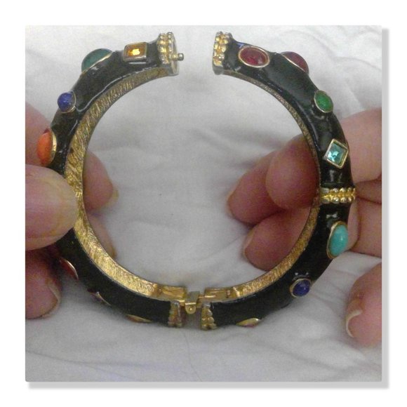 Kenneth Jay Lane bracelet in gold tone with multi-colored cabochon stones in a black enamel setting. Magnetic clasp. Marked Kenneth Lane. 6"