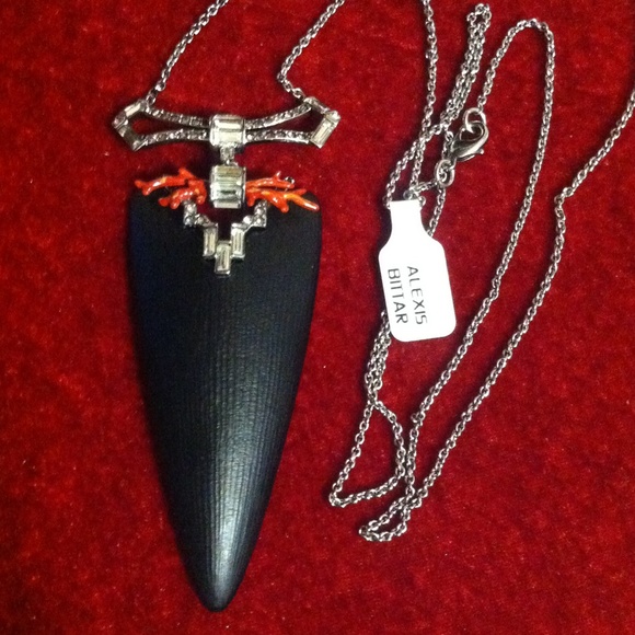 Art Deco Style Serious Statement Making Alexis Bittar Black Lucite/Coral/Swarovski Baguette Pendant Necklace. Suspended on Silver Tone Chain w Lobster Clasp Closure Approx 30" Long. Pendant Approx 4"x1.5". Alexis Bittar Stamp on Back. GORGE!!!!