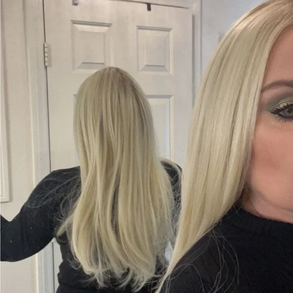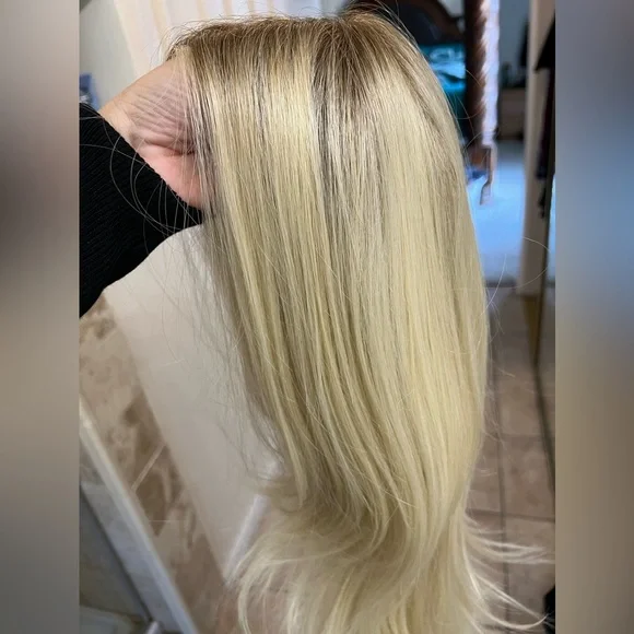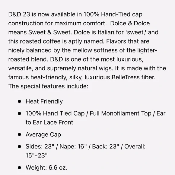 Wigs for every woman Serendipity wig hand tied in Hollywood blonde. Same wig as Belle tress dolce and dolce in bombshell blonde.Great used condition, very comfortable hand tied cap and full monofilament. Heat safe synthetic fibers. Retired style and color that is hard to find.