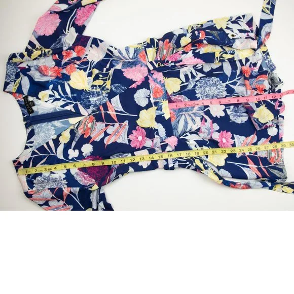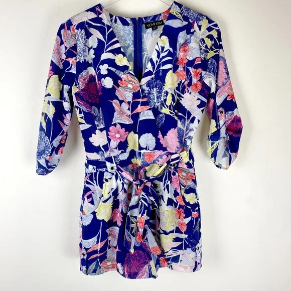 Yumi Kim Liz Romper Floral V-Neck Belted Tropical Vaca Blue Pink Yellow Size XS. This vibrant floral romper features a gorgeous mix of blue, white, pink, and yellow for a bold...