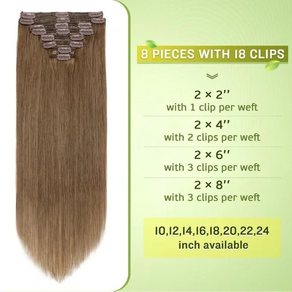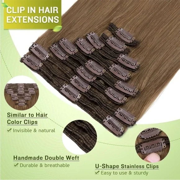 Color: #6 Light BrownMaterial: Clip, Human Hair Extension Length: 22 InchesStyle: StraightARRIVES NEW 100% REAL HUMAN HAIR - natural soft remy human hair extension clip ins. Can be dyed, washed, bleached, curled and straightenedEASY TO WEAR - you can easily to apply and remove the clip on the hair extensions by yourself. No heat, no glue, fast fits and damage-free, especially friendly for starters.DOUBLE WEFT HARE EXTENSION - compared with standard weft, double weft means 2 weft sewed together which is thicker than normal weft, adding more hair volume. Perfect for wedding, dating, party or other daily moment.8PCS FLEXIBLE TO USE - real hair clip in extension is in a set of 8pcs, different length of wefts apply in different hairzone both sides and back of your head. Recommend: use 1-2sets to thicken your hair, 2-3sets if you like heavy volume.Additional parts: two clips,thread and needle. If there are any questions about human hair extension, please let us know and we will do our best to solve the problem.