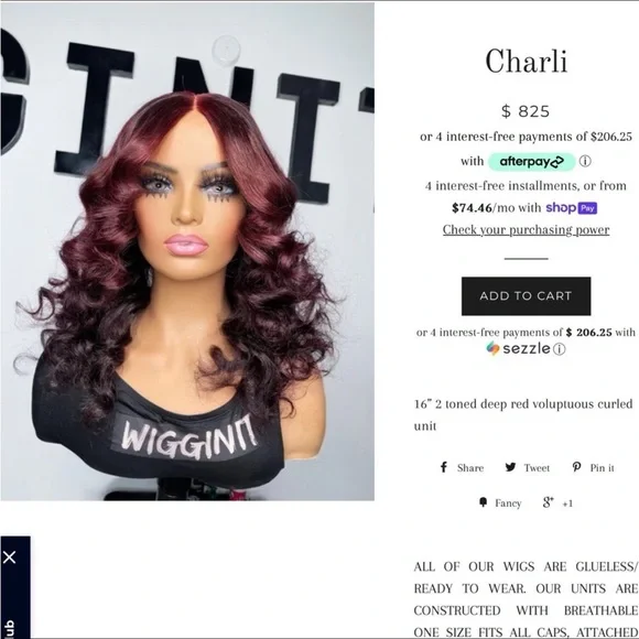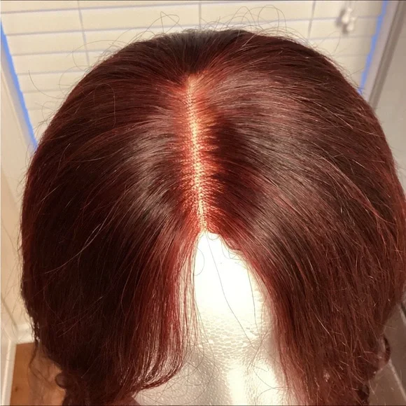 New! Absolutely gorgeous wig! Purchased from Wigginit Wigs! Lightweight wig. 16” wig. Two toned deep red voluptuous curled unit. 100% human hair wig, hand dyed, hand sewn to cap, lace cut, knots bleached, and pre-plucked. Ready to wear wig. Glueless wig. Also has adjustable headband attached. Brand new wig! Excellent condition. Original cost $825. Wigginit “Charli” Wig. Curls have fallen.