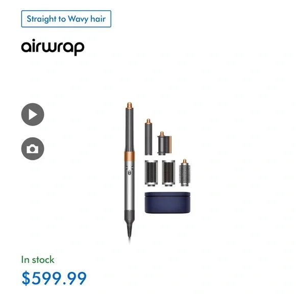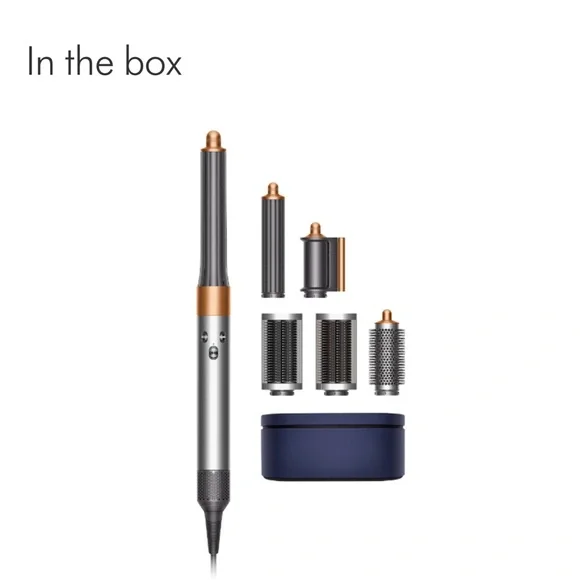 Complete hair styling set by Dyson. Includes multiple attachments for versatile styling. Sleek silver and copper design. Small ding on metal airflow from traveling. Gently used product, but in excellent working condition.