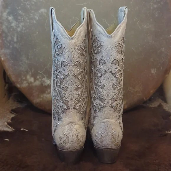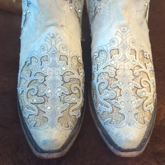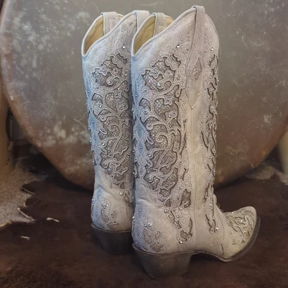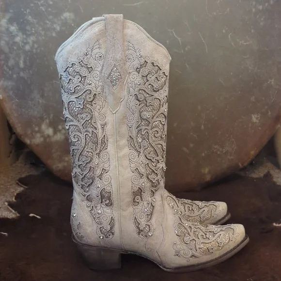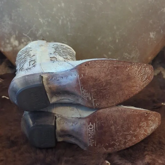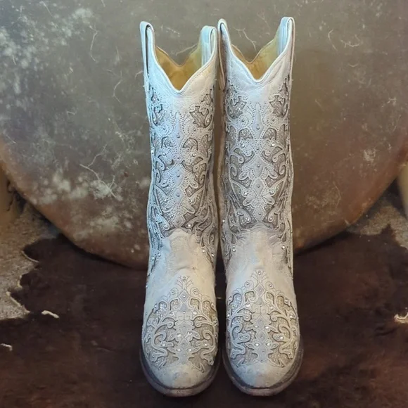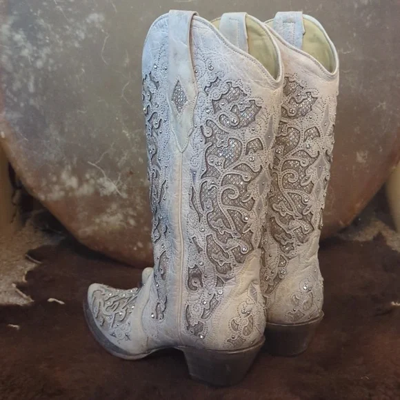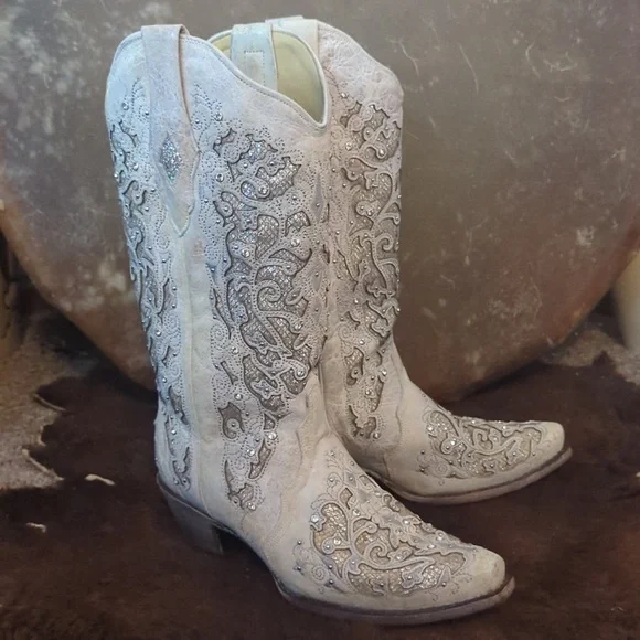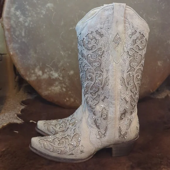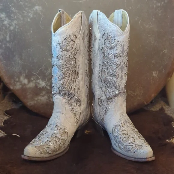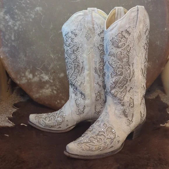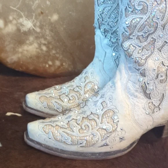 These CORRAL Ivory leather boots with glitter inlay and crystals are simply stunning! Featuring distressed & aged white/bone leather with glitter inlay and lots of crystals. Style #A3322, part of Corrals bridal collection. This boot is a perfect choice for your wedding or special occasion! These luminous beauties will be beaming with the bride. Beautiful handmade boots that are also super comfortable and are great for that magical first dance.Snip toe, stacked leather riding style heel, light colored leather soles, leather pull tabs and fully leather lined with super soft pigskin leather. Shaft Height 14"Heel Height 2.5"Calf Circumference 16.5"Size 9.5 M (regular width)Excellent pre-owned condition. Still very much like new. Worn once for an indoor wedding ceremony. Very light wear on leather soles. Light wear on heel backs & heel caps. Very slight rub at toe ends. Leather is still stiff & like new. Sprayed with quality leather protector prior to wear. Do not come in original Corral box. Non-smoking and pet free homeWe are a big rodeo & ranching family that LOVES good quality boots. We are a 3rd generation ranch family and we wear boots all day every day so we get what makes a boot great! Our boot game is fierce & we love helping others find a great pair!!! We carefully inspect & assess every pair of boots & research retail costs, rarity, comparisons, & quality of materials & workmanship paired with ´s 20% commission to come up with our pricing.