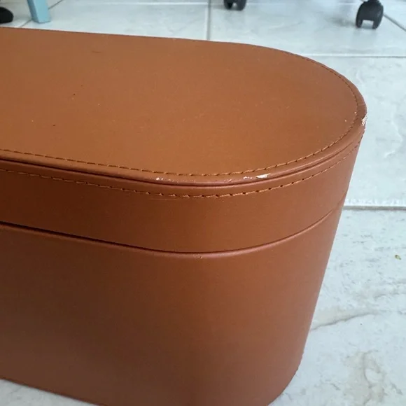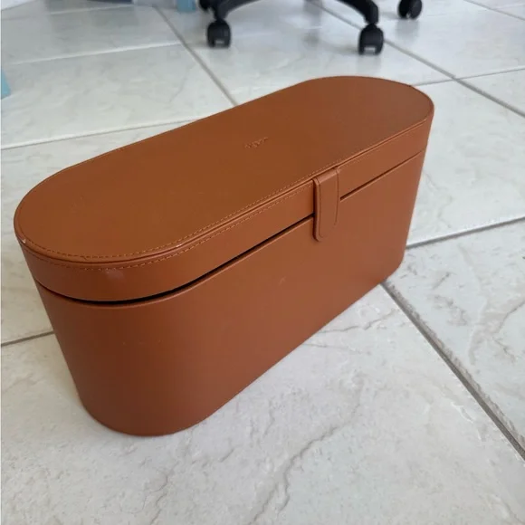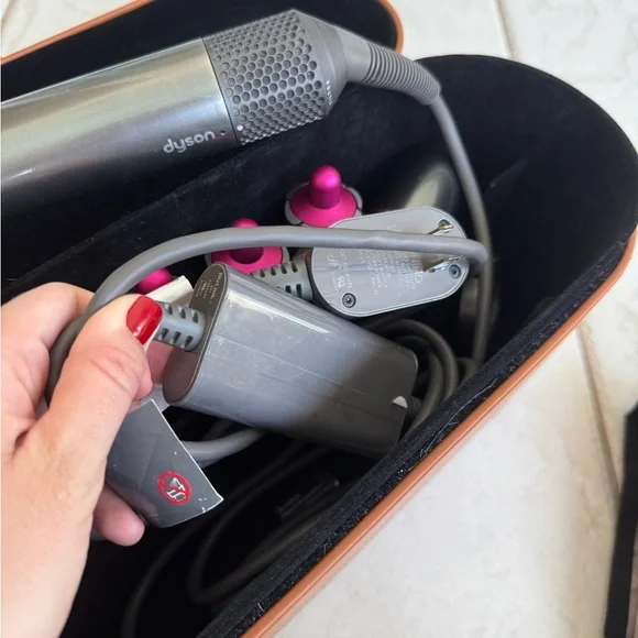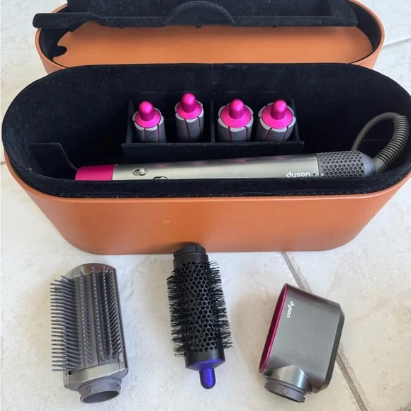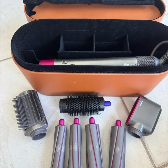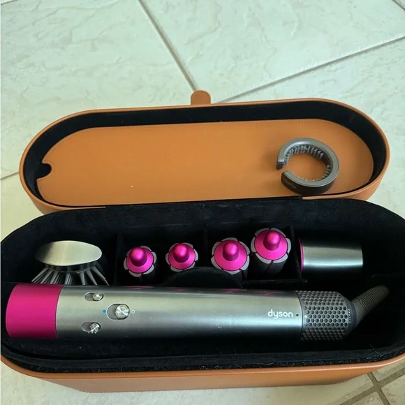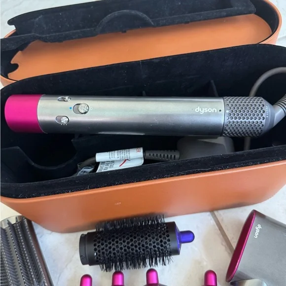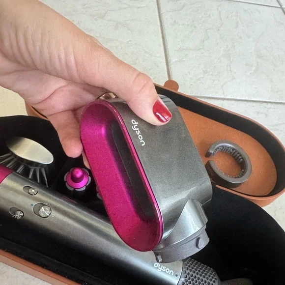 Perfectmy working Dyson Air Wrap. Selling because I prefer my AirStrait. Comes with all original attachments + a round brush attachment I purchased separately. Original case and cleaning attachment included. Case is peeling a bit - unsure why, I never used it and it has been stored nicely in my closet. As you can see, plastic wrap is still on the wire. Will also throw in the Dyson travel bag I purchased. Great for trips because the leather case is huge.