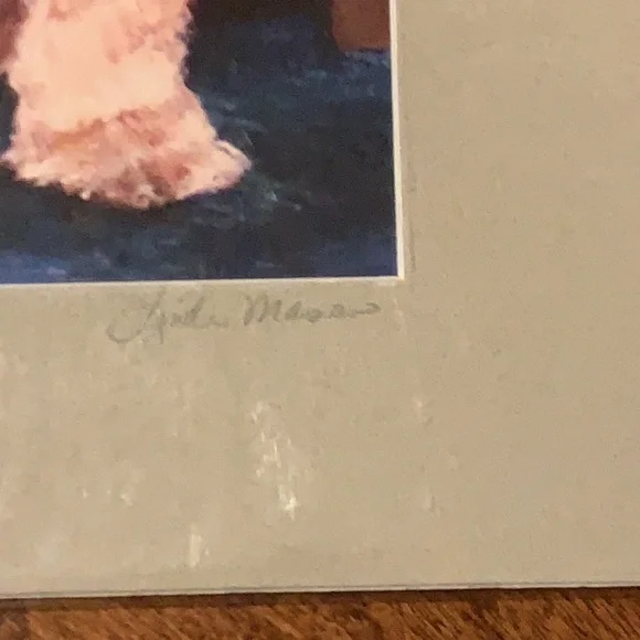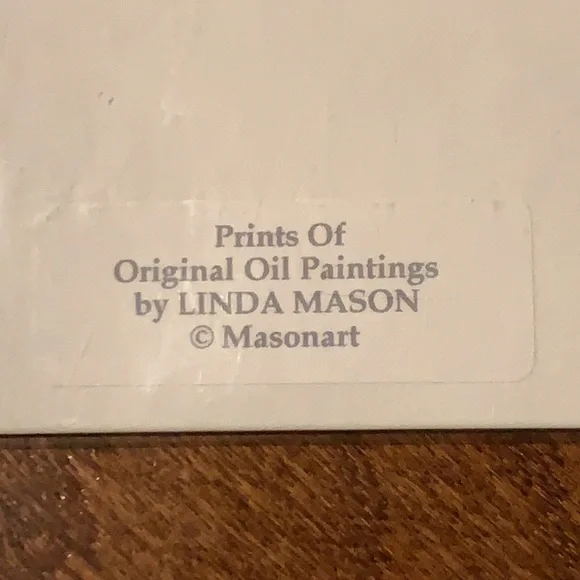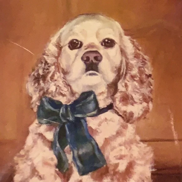 New in package. Signed print of original oil painting by Southern California artist Linda Mason of a cute cocker spaniel with blue bow.