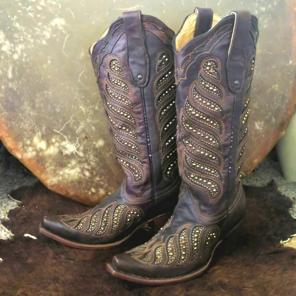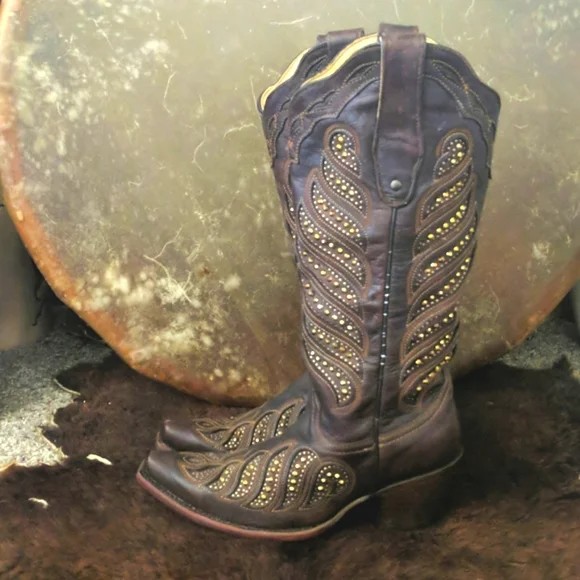CORRAL gorgeous ladies rich brown leather cowgirl boots. Style #,C2878. Handmade in Mexico. Lightly distressed/aged leather with beautiful studded inlay in a feather design. Made...