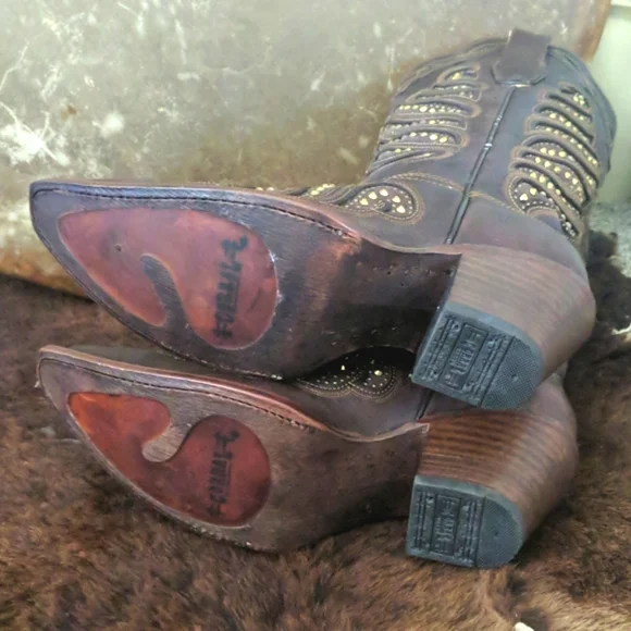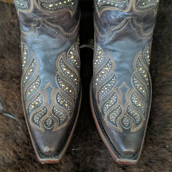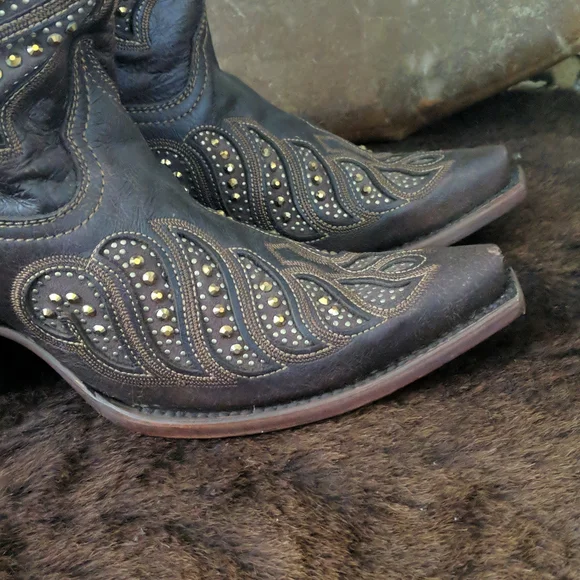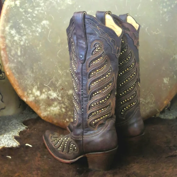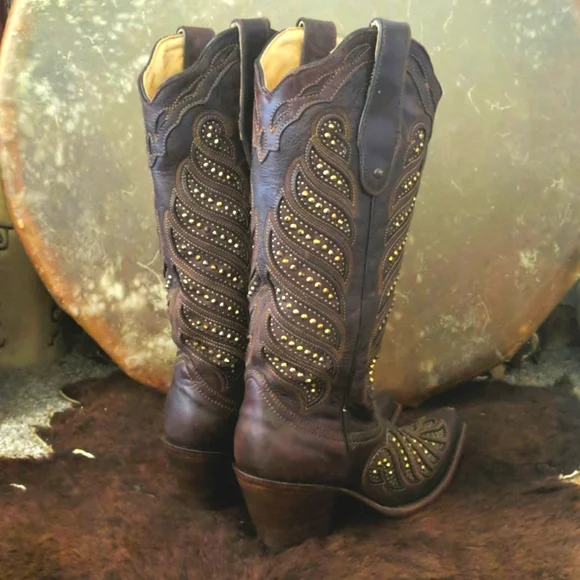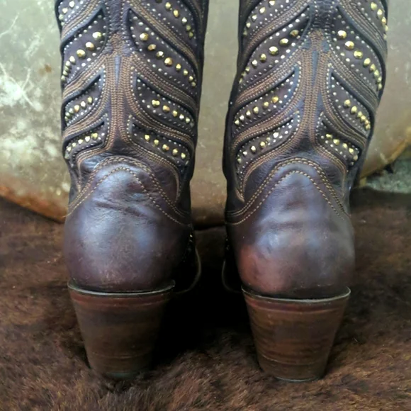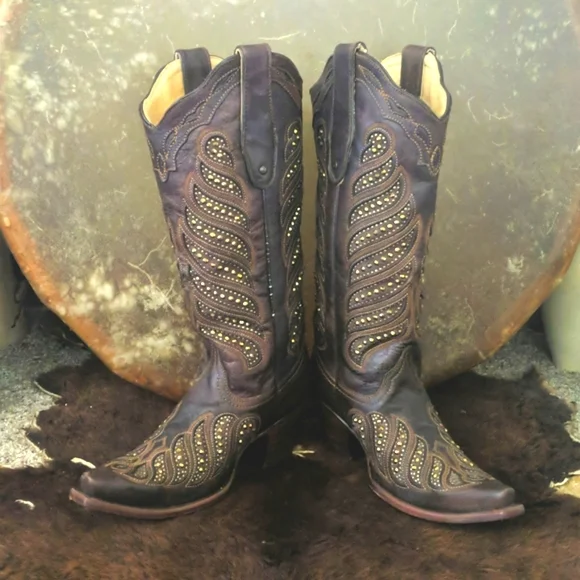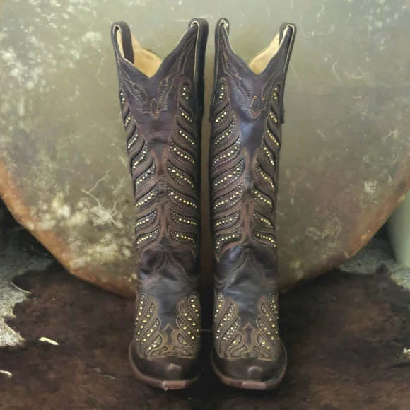 CORRAL gorgeous ladies rich brown leather cowgirl boots. Style #,C2878. Handmade in Mexico. Lightly distressed/aged leather with beautiful studded inlay in a feather design. Made to look vintage/aged intentionally by maker. Snip toe, stacked leather riding/dress heel, leather soles & insoles and full leather lining. Beautiful boots, excellent pre-owned condition. Only worn 3-5x. Very light wear on soles & heels. No visible wearing down, no heel drag on heel caps.Very slight slouching above heel nacks & at throat. Several small scuffs/scratches, please see pics. Some cracking on piping up sides of boots, purely cosmetic, shown in last pic.Sprayed with leather protector prior to wear. Carefully stored. Do not come in original Corral box. Non-smoking and pet free home.We are a big rodeo & ranching family that LOVES good quality boots. We are a 3rd generation ranch family and we wear boots all day every day so we get what makes a boot great! Our boot game is fierce and we love helping others find a great pair!!! We carefully inspect & assess every pair of boots & research retail costs, rarity, comparisons, and quality of materials & workmanship paired with ´s 20% commission to come up with our pricing.We do not accept trades and we do not entertain low-ball offers. We ship every M-W-F
