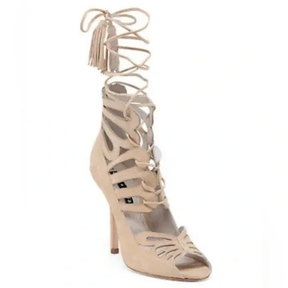 Alice + Olivia Suede Natalie Heels NIBScalloped suede alice + olivia gladiator sandals in a knee-high silhouette. Exposed back zip and tasseled lace-up closure. Leather sole.Leather: Goatskin.Color: Soft SandGive your style and free spirit a jolt wearing the Alice + Olivia™ Natalie.Suede leather upper.Back-zipper and lace up closure with tassels.Peep-toe silhouette.Leather lining.Leather insole.Wrapped stiletto heel.Leather outsole.Imported.cut out detail, lace up vamp, tassel accents, cushioned insole, refer to size chart for european sizing4.5in. heel approx depending on sizeIncludes Shoe Dust BagCustomer Service Policy: We are not an expert on everything we sell, so some of our knowledge may be limited. As for shoes and clothing on manufactures overall fit Prior to sending, photos are taken of item with shipping label and a zip tie tag attached to represent the item purchased and shipped
