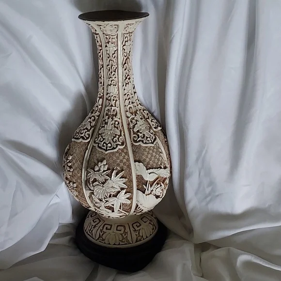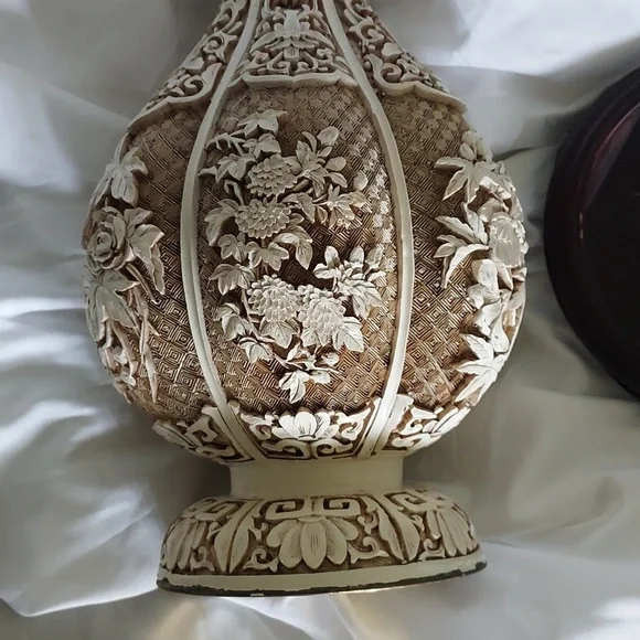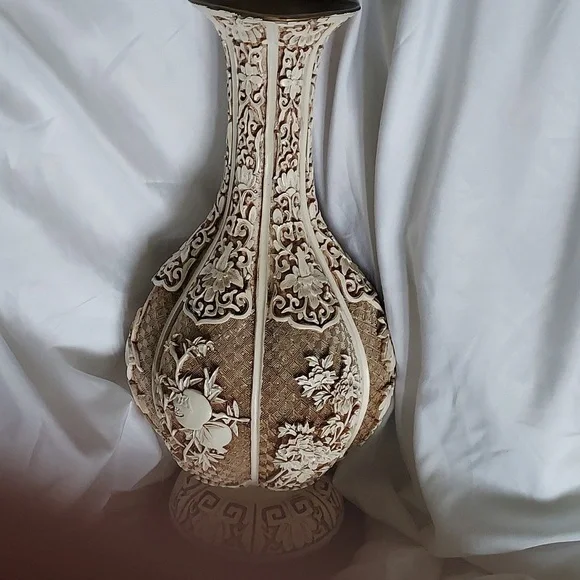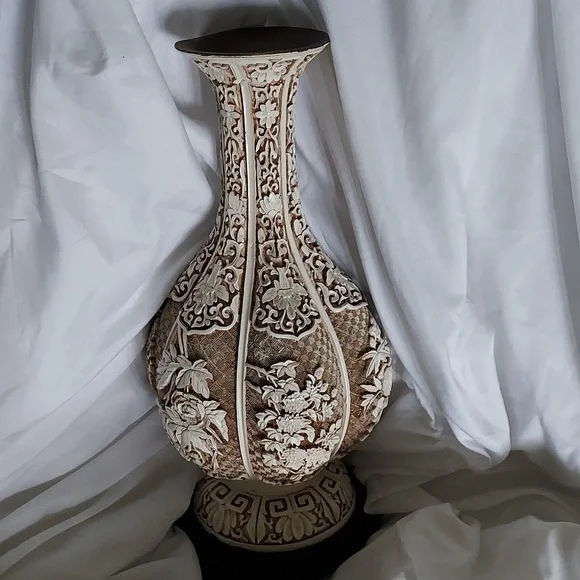 Beautifully detailed floral vase with a matching stand. Features a cream and brown design. Vintage vase stands 12.5 inches tall. From a smoke free pet free home and there are no chips or cracks. The details are amazing to just look at and study every detail. shipping the next day