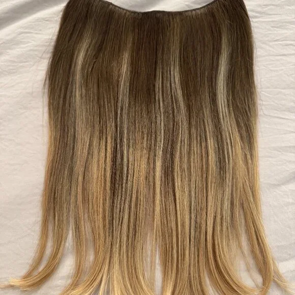 The Layered HALO® is our most popular extension. Uniquely designed and unlike any other product available, it has 2-3 built-in, gradual layers, providing a seamless blend with natural hair. With 30% more grams than The Original HALO®, The Layered HALO® delivers maximum volume for dense or thick hair.Has been worn ONCE for a few hours. Trimmed to 16 inches.
