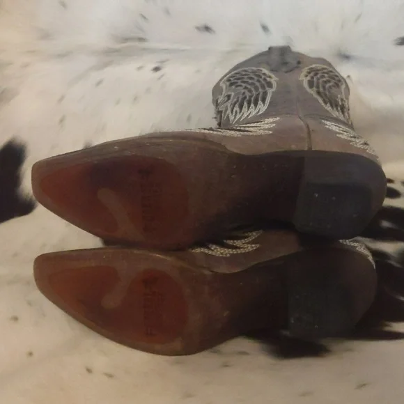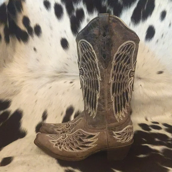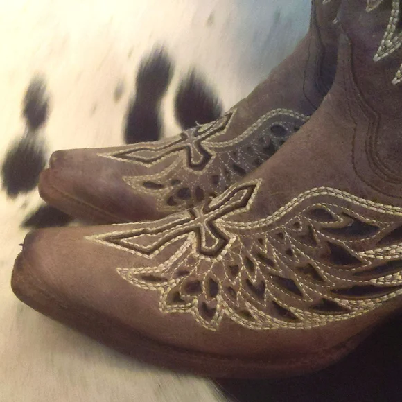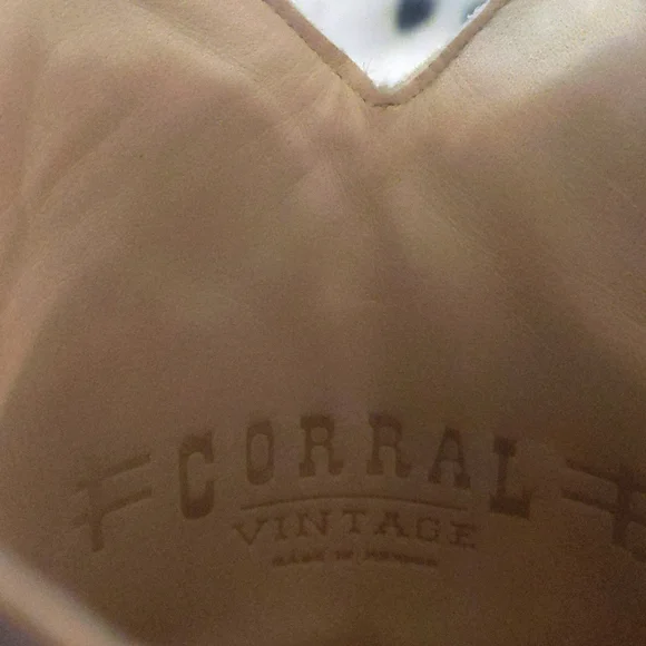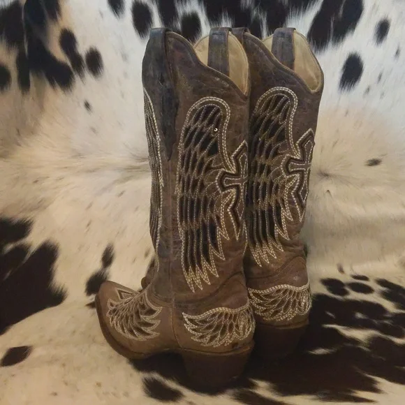 CORRAL distressed, handmade leather cowgirl boots. Style #A1241 from Corrals Vintage line. Heavily distressed (intentionally by maker) brown/taupe colored leather with inlaid winged cross designs. Black sparky leather inlaid & ivory stitching around designs. Square toe, 1.5" roper heel, leather lining, 13" shaft, leather sole. Handmade in Mexico, superior quality and workmanship. Pretty enough to rock a country wedding paired with a cute dress but practical enough to wear every day with jeans. Size 7.5 M (regular ladies width)Excellent pre-owned condition. Light wear on soles & heel caps. Few scratches on stacked leather heels, slight wrinkling or softening of leather at boot throat and above heels. Sprayed with quality leather protector prior to wearing. Carefully stored. Do not come in original Corral boot box.First picture is a stock picture, for reference only, all remaining pics are of actual boots being sold. Non-smoking and pet free home