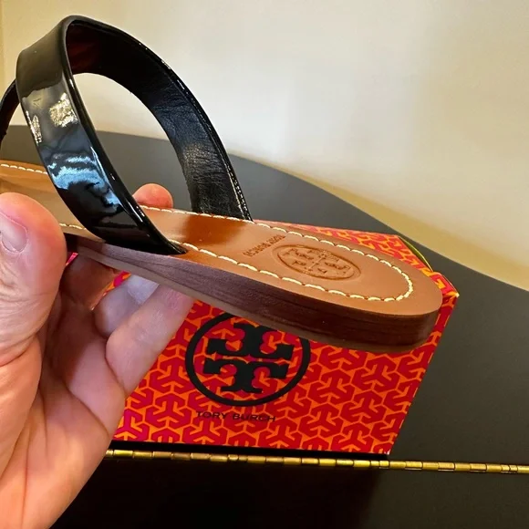 Authentic Rare Luxury Minimalist Tory Burch Black Patent Cameron Thong/Shoes-The iconic sandal with a cult following, loved for its timeless style and comfort, the warm-weather must have is elevated in rich patent leather straps and a signature double T plated brass logo charm (little over .75” W)-Crafted in partnership with a Leather Working Group-certified tannery, supporting high standards in leather manufacturing and chemicalmanagement-high quality patent calf upper-Napa leather lining & on underside of straps, topstitching on lining, signature double T logo & TORY BURCH laser cut on leather lining, color of lining is more like stock pics, very few indentation marks & slight creasing on lining, tried to show in pics -rubber sole with signature double T logo embossed-low heel, between .25” - .5” H-size 8 (8M on shoes, 8 on box)-made from high quality leather,any creasing or irregularities are natural features of leather which makes each piece unique, example pic of leather under strap, how made & purchased, all were like that-pic of left shoe outside of heel, very small spot where color very slightly lighter than rest of heel, how made & purchased-original box included, don’t think box was originally assembled as good as could have been, how made, in pics-gift with purchase, include more than one nice gift with each purchase, please check out reviews-SOLD OUT ONLINE & IN STORES, RARE