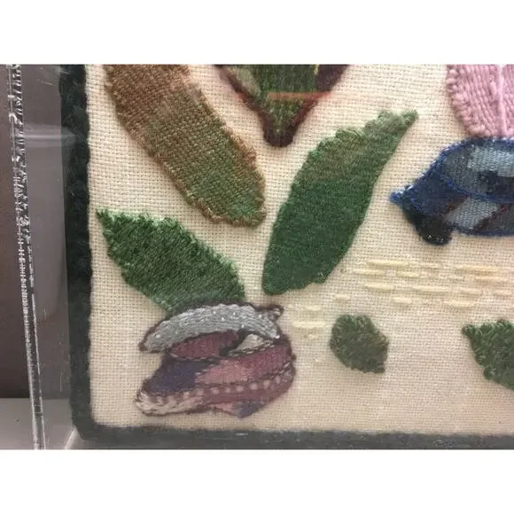 Large Crewel Embroidery Scene Appliqued onto Aida Cloth Beads Plexiglas Frame