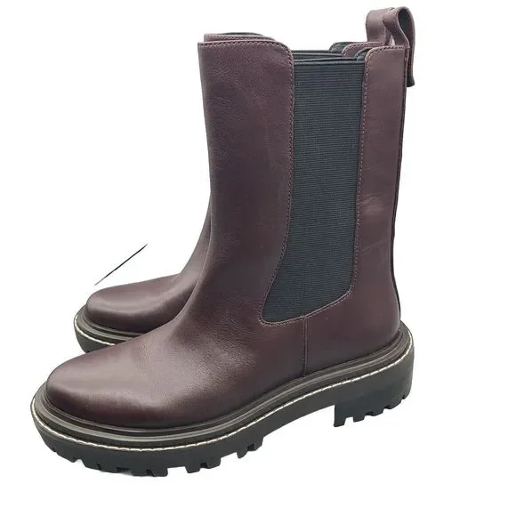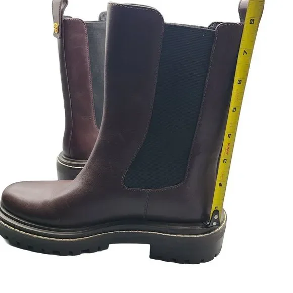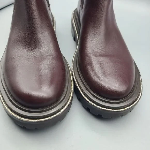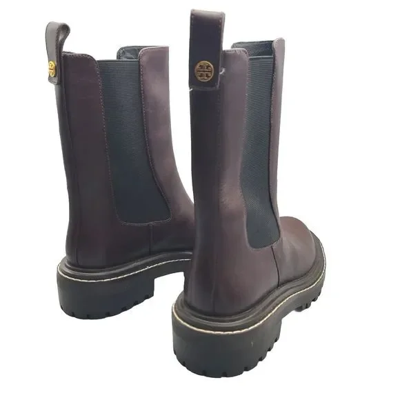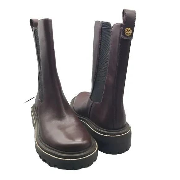 Tory Burch ´Benton" pull-on boots Chelsea style Size 7.5 M New in TB box ( not from the exact pair) $428 Burgundy leather upper with Gold-Tone Hardware Logo Accent And Pull-On Tab Elasticized Slip-On Style Lightly Padded Leather Insole Rubber Lug Sole 1.5" Heel and 1" Platform 7.75" Shaft high , 11.75" top Circumference
