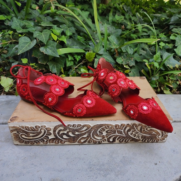 This Yasmin D´Orsay flat has the feel of a rare marketplace treasure. Richly embroidered, it shines with shisha mirrors and seed beads on a pointed-toe with suede straps.•New with box#0000010452401