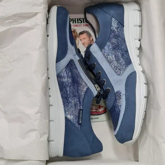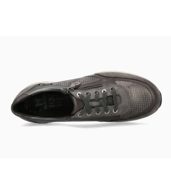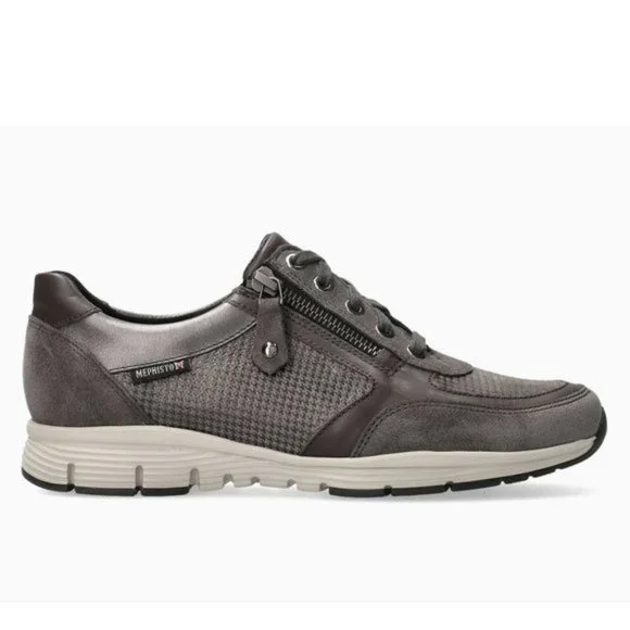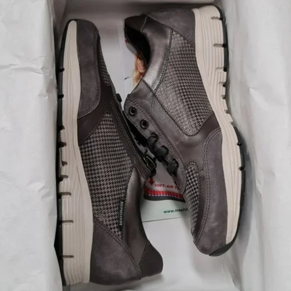 New?see picturesColor Name: GreyLeatherSynthetic soleMake your weekend enjoyable in the relaxing and athletic-inspired Rebeca sneaker from Mephisto.Soft suede uppers with a round toe.Low-profile silhouette with a cushioned tongue and collar.Adjustable lace-up closure.Features interchangeable AIR-JET footbed with integrated SOFT-AIR technology helps circulate air with each step in cushioned comfort.Durable rubber outsole.