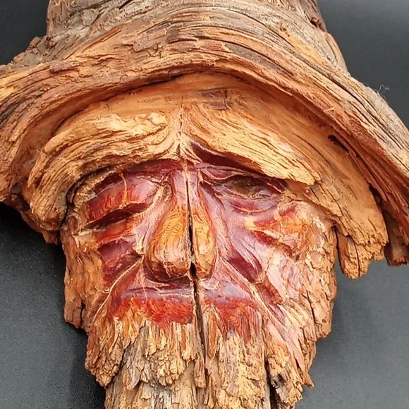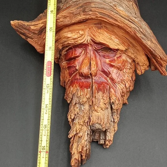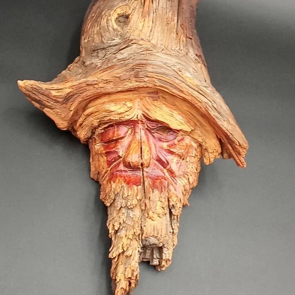 Wooden folk art tree spirit sculpture in good used condition, artist signed FJ and numbered on back. Unique one of a kind hand made green man, wizard, gnome.Measures about 16" by 9".*cannot be bundled due to size/weight and or fragility.