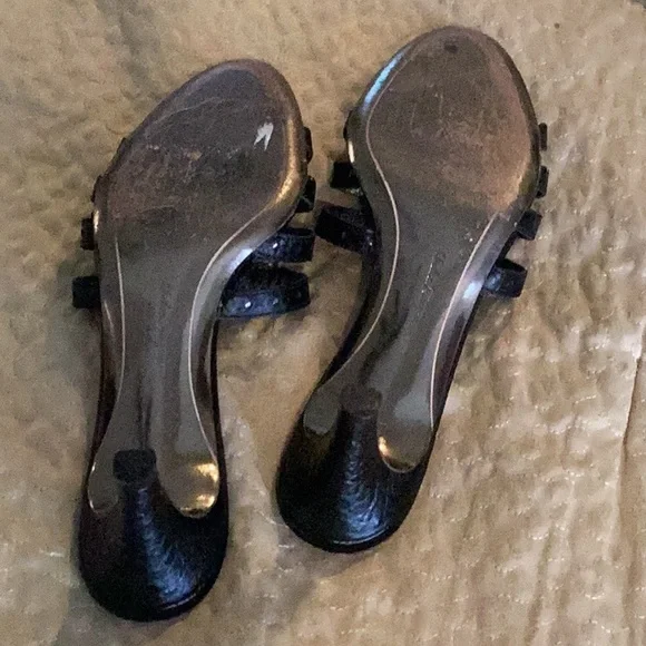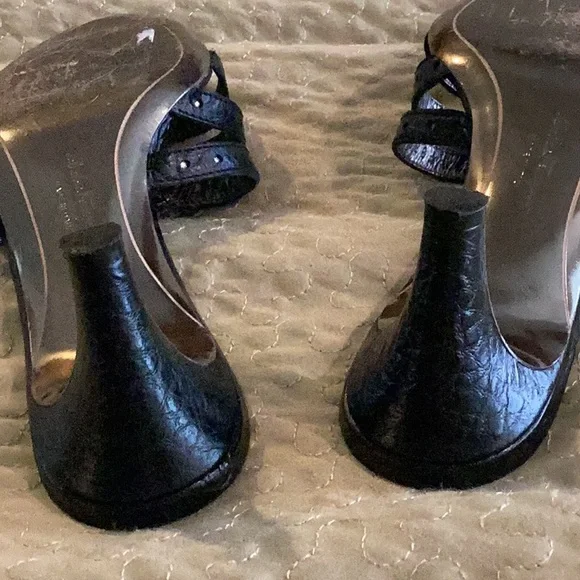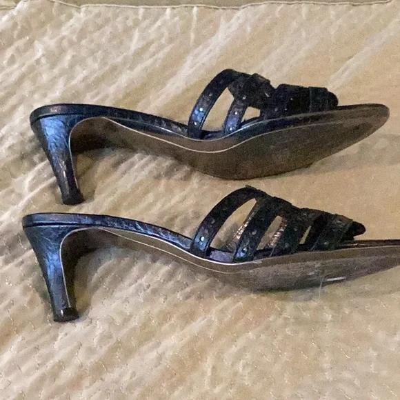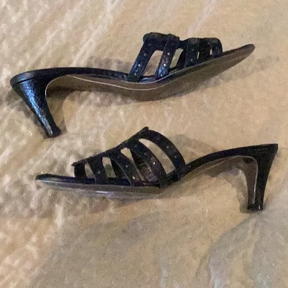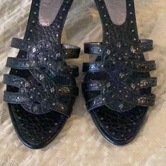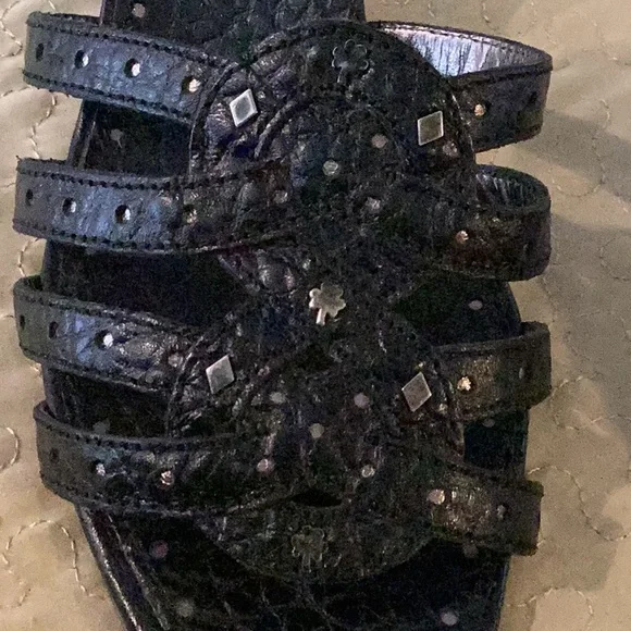 These are sandals are absolutely gorgeous and the detail of them is unbelievable.They are black strappy mules with studs in clover and diamond shapes.The sides of the straps have...