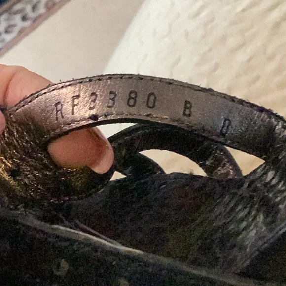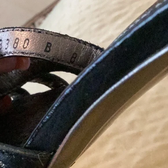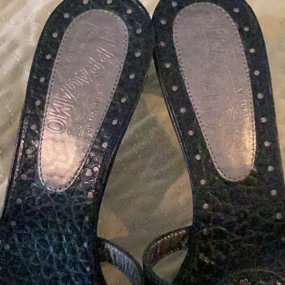 These are sandals are absolutely gorgeous and the detail of them is unbelievable.They are black strappy mules with studs in clover and diamond shapes.The sides of the straps have cut outs with silver dots showing through.Beautiful leather insoles with silver Ferragamo labels.Shoes are a size 8 but run small and would better fit a 7 1/2.These shoes were worn a handful of times, and are in pristine, like new condition.