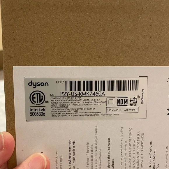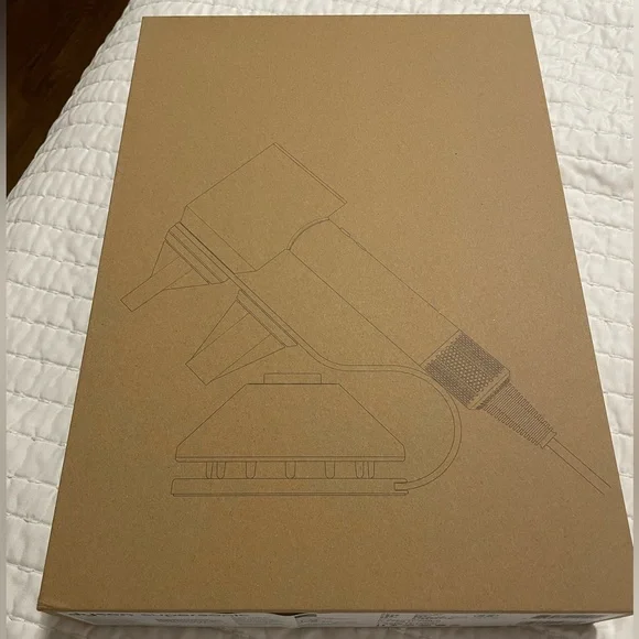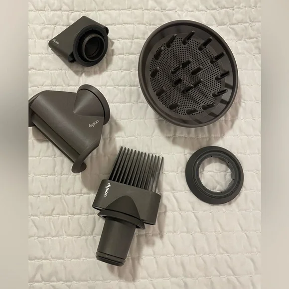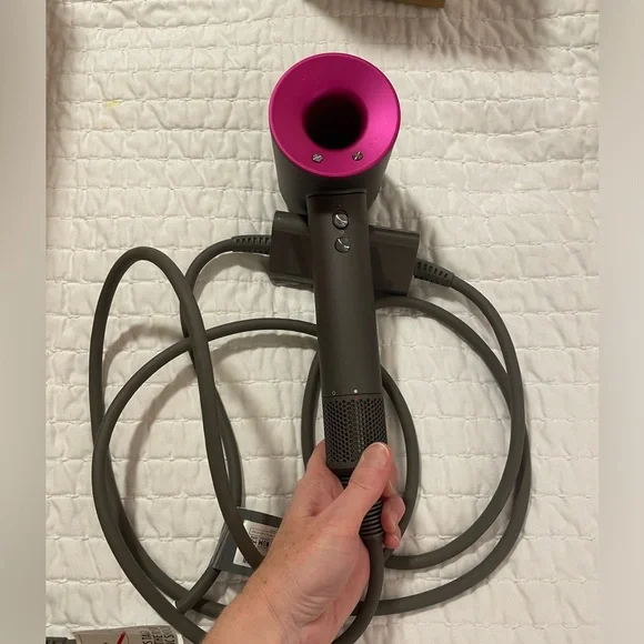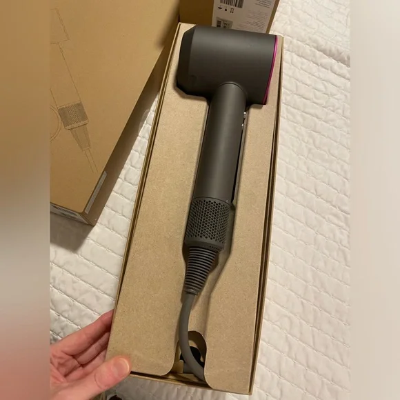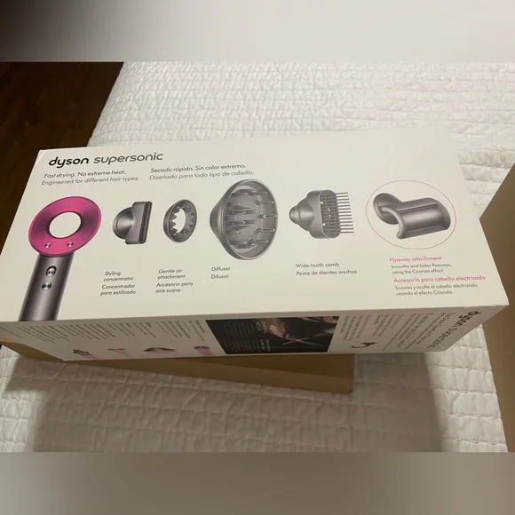 New, but has been taken out of the box and tested Dyson Supersonic Hair Dryer with 5 accessories. Also included is a metal stand that box has been opened for pic but not touched otherwise.