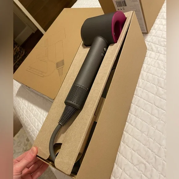 New, but has been taken out of the box and tested Dyson Supersonic Hair Dryer with 5 accessories. Also included is a metal stand that box has been opened for pic but not touched...