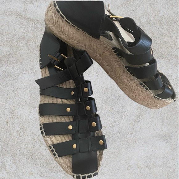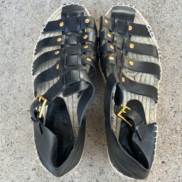 Tory Burch Fisherman- Platform Espadrille Sandals A new take on the fisherman sandal. The closed-toe, multi-strap design combines leather and braided jute with discreet brass...