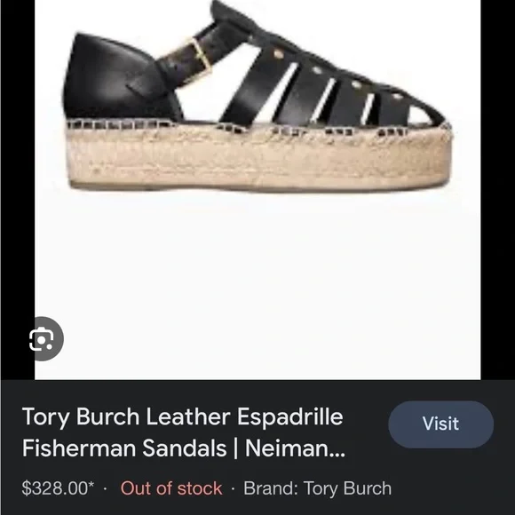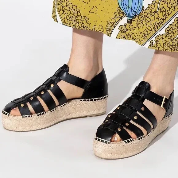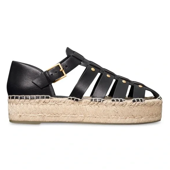Tory Burch Fisherman- Platform Espadrille Sandals A new take on the fisherman sandal. The closed-toe, multi-strap design combines leather and braided jute with discreet brass hardware. A jute-wrapped platform sole, oversized straps and a buckle offer long lasting comfort and a flattering fit.