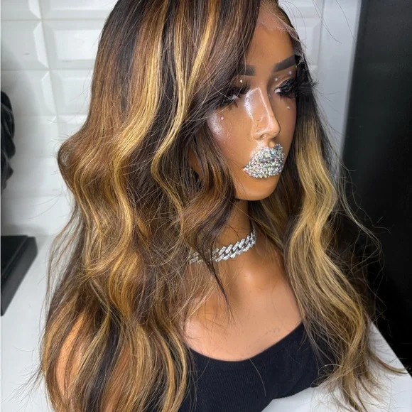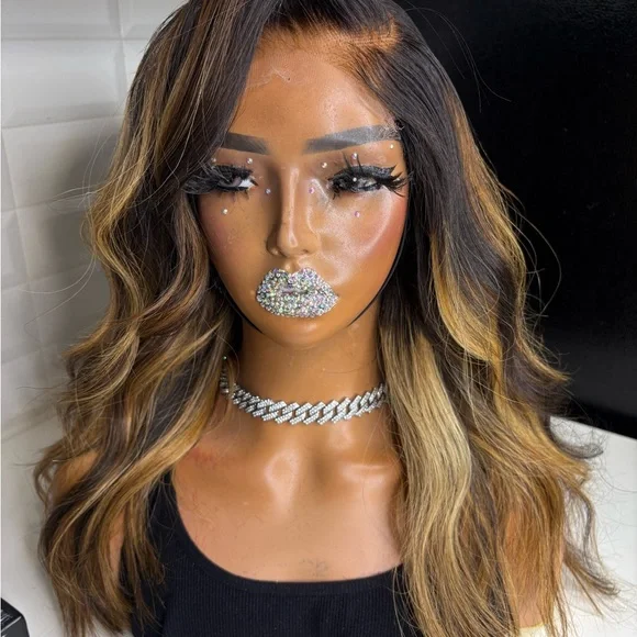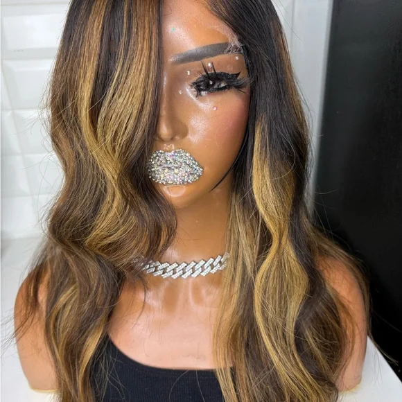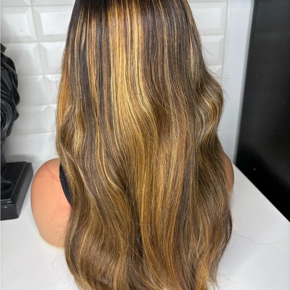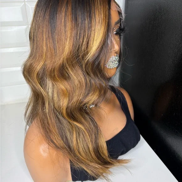 Custom wig ready to ship Made on the sewing machine 5x5 closure 2 raw bundles 18”20”blonde & brown streaks. medium cap 22 adjustable strap comb in the back