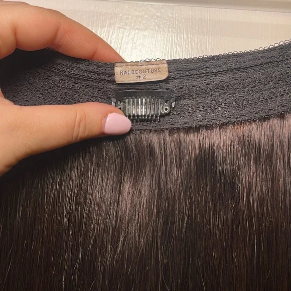 Halo couture real HUMAN HAIR HALO 24” but cut to shape so around 22”. Paid for a wedding and then don’t need anymore. Worn only 3 times.