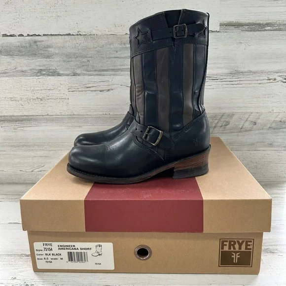 FRYE Engineer Americana Stars & Stripes Short Leather 150 Year Anniversary BootsSize 8MBlack | Grey Style 75154Pull On StyleGreat Pre-Loved Condition Comes with box